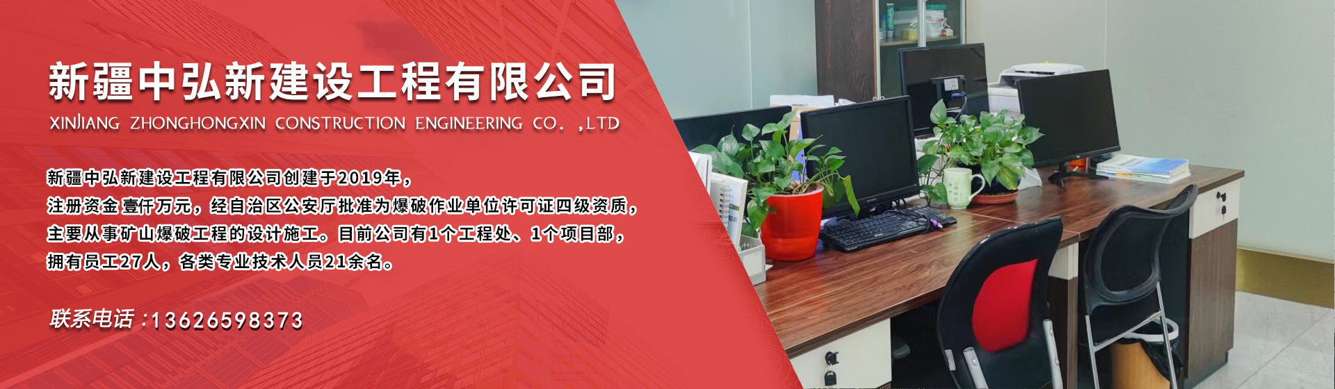 ZHONGHONGXIN CONSTRUCTION ENGINEERING   公 司 簡 介新疆中弘新建設工程有限公司創(chuàng)建于2019年,注冊資金壹仟萬元,經自治區(qū)公安廳批準為爆破作業(yè)單位許可證四級資質,主要從事礦山爆破工程的設計施工、礦上采掘施工業(yè)務。目前公司有1個工程處、2個項目部,分...